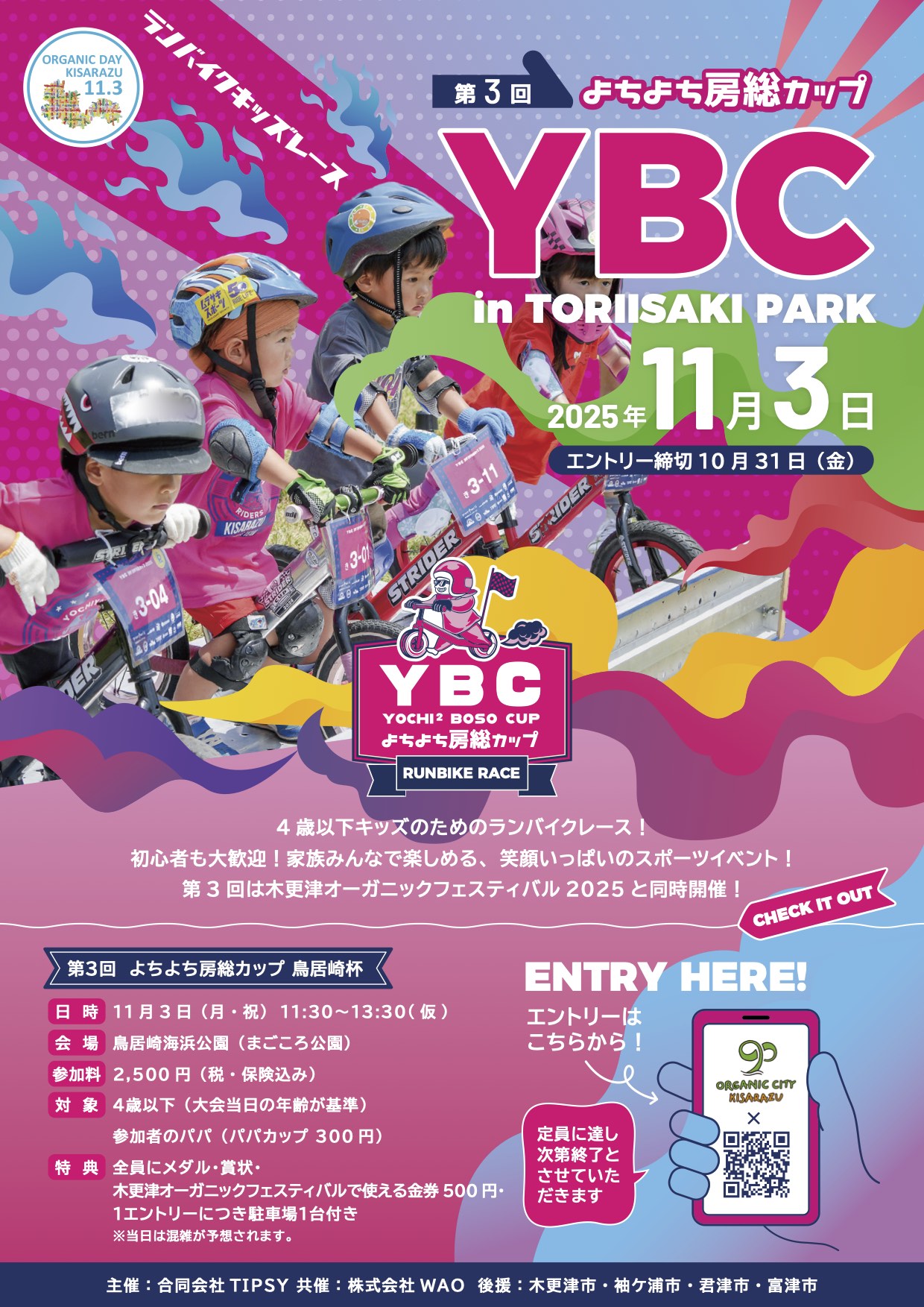 - 地域の子育て世帯の孤立や、未就学児の運動機会の不足を背景に、4歳以下を対象としたランバイクイベント「よちよち房総カップ(YBC)」を開催します。6月に第1回大会を実施し、年度内に全4回の開催を予定。地元企業や子育て支援団体、行政と連携し、協働で運営しています。本イベントでは、地域の未就学児とその家庭を対象とすることで高い公益性を有しており、今後の継続開催に向けて運営ノウハウの蓄積と体系化を進めることも目的の一つです。将来的には観光地との連携など、地域資源を活かした波及的展開も視野に入れています。
